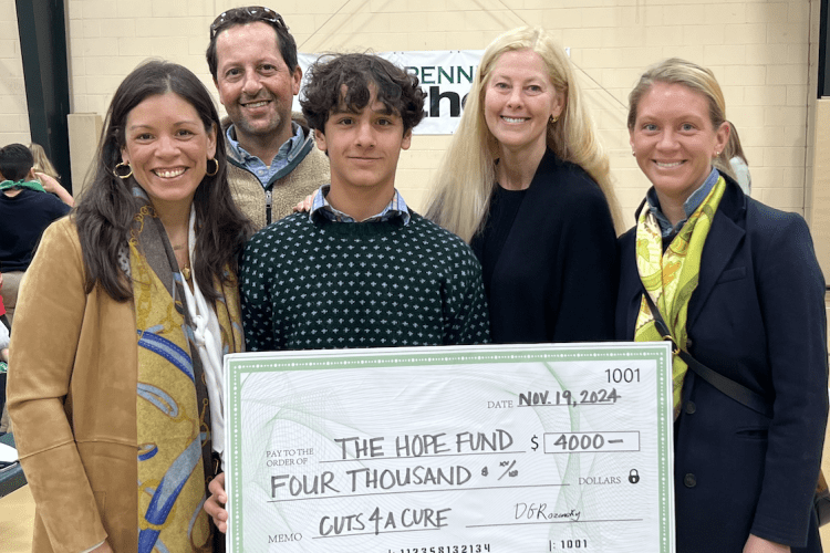 At a school assembly, Dylan presented a $4,000 check to two Hope Funds Trustees, the culmination of his entrepreneurial venture, Cuts for a Cure. The lawn care service, which Dylan established and managed, donated all proceeds to the organization’s annual fund.